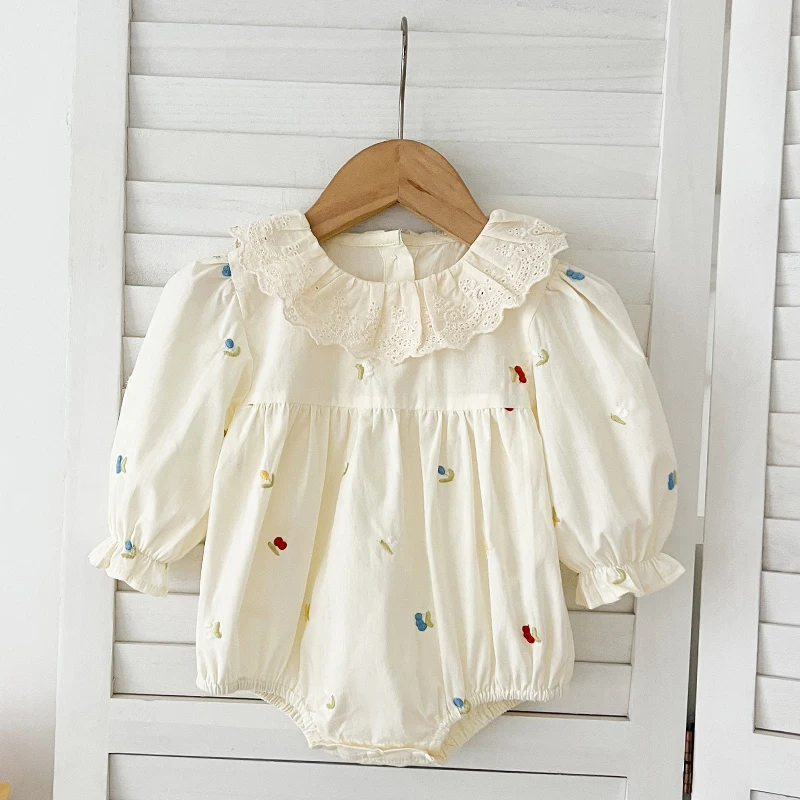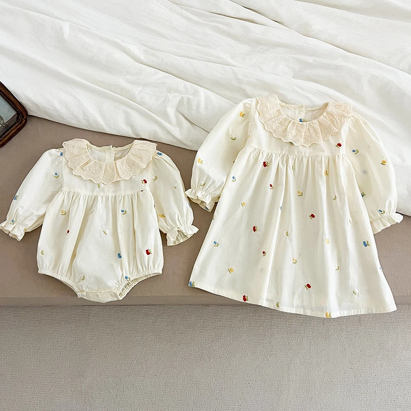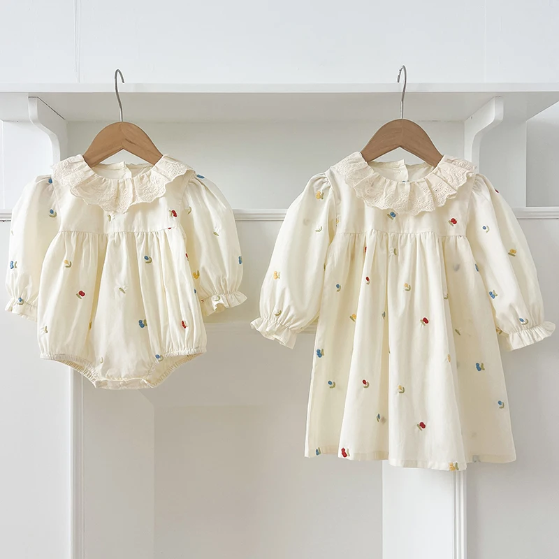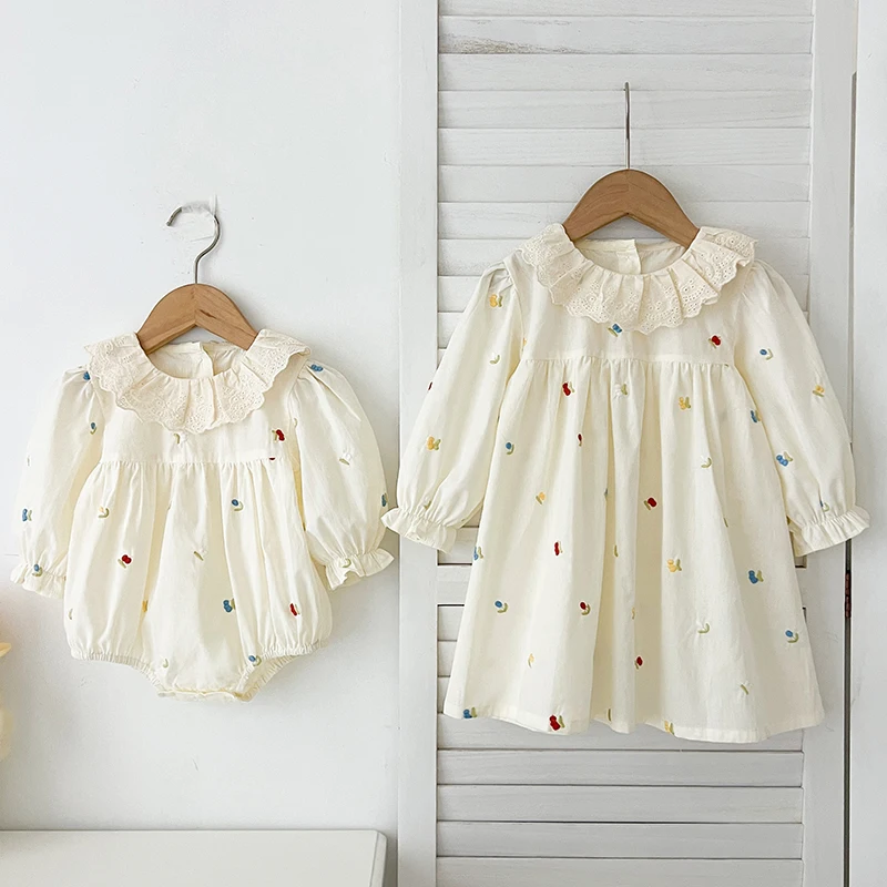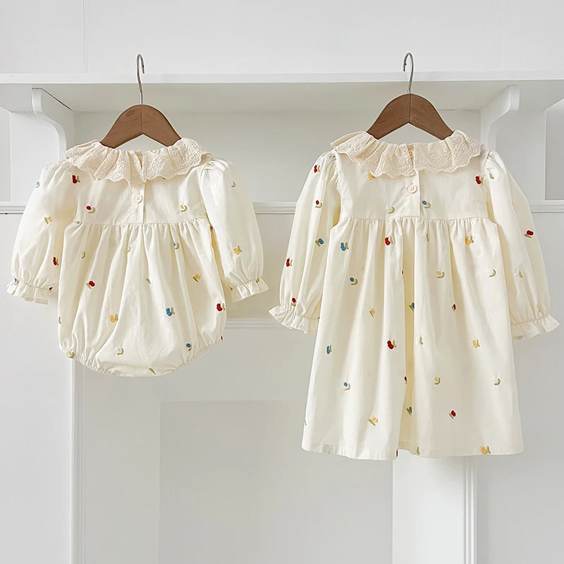 Spring Family Matching Outfits Sister Clothing Lace Collar Girl Party Dress Flower Embroidery Kids Princess Dress Baby Romper