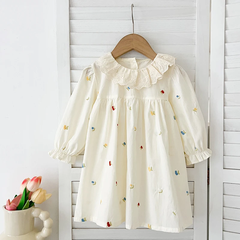 الربيع الأسرة مطابقة وتتسابق شقيقة الملابس الدانتيل طوق فتاة فستان الحفلات زهرة التطريز الاطفال فستان الأميرة رومبير الطفل