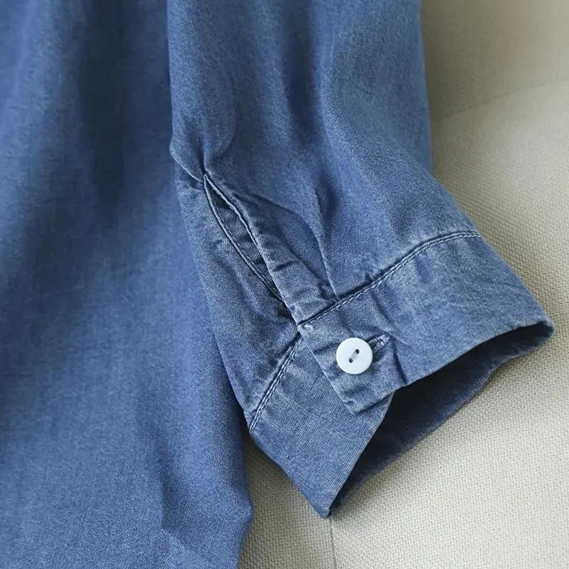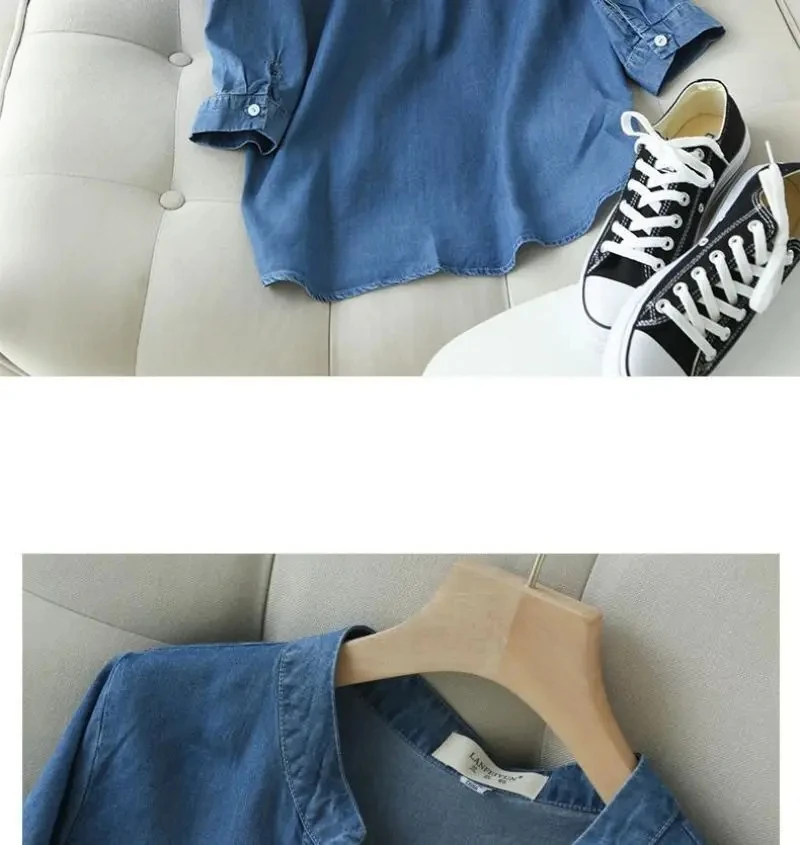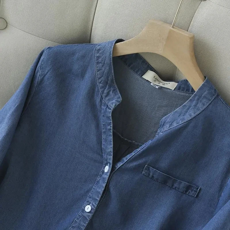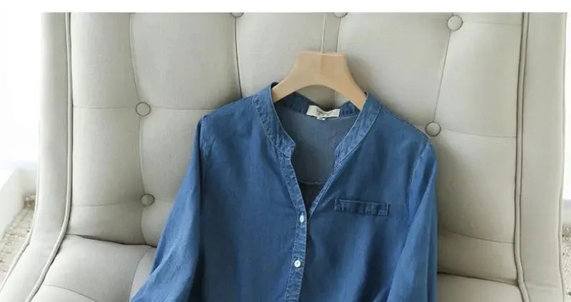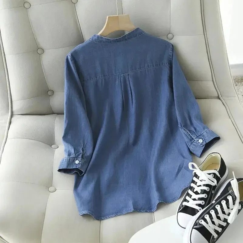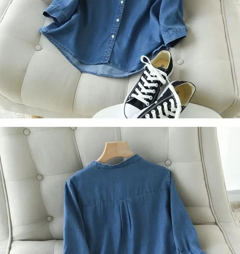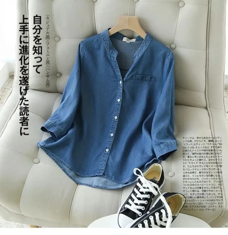 بلوزة زرقاء ذات تصميم دينم أزرق عصري برقبة على شكل حرف V، مع أزرار أمامية وقصة مريحة تمنحكِ إطلالة كاجوال أنيقة مستوحاة من الموضة الكورية.