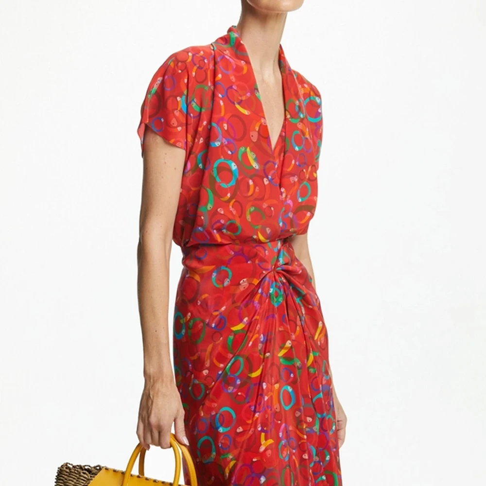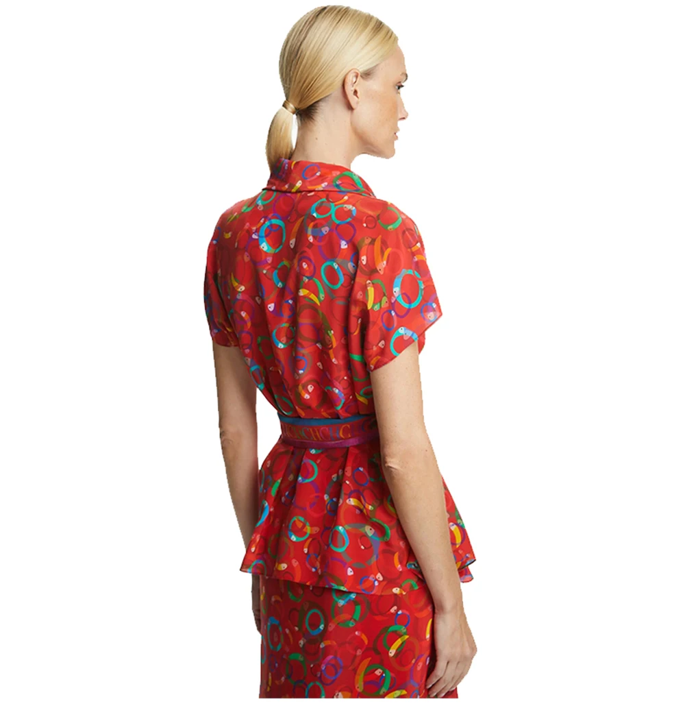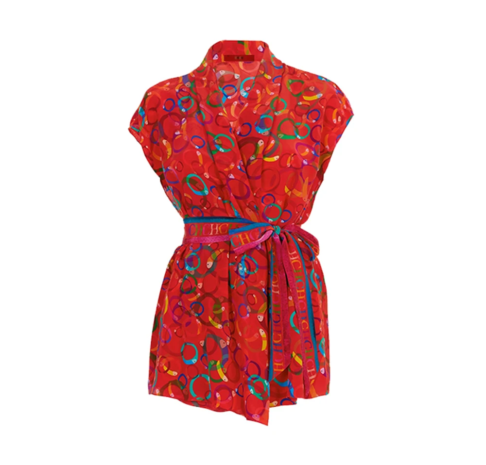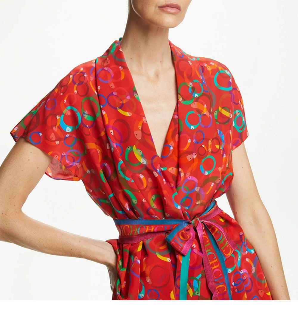 - تجعل إطلالتكِ أكثر حيوية وجرأة بفضل اللون الأحمر المفعم بالطاقة والنقوش الهندسية اللافتة