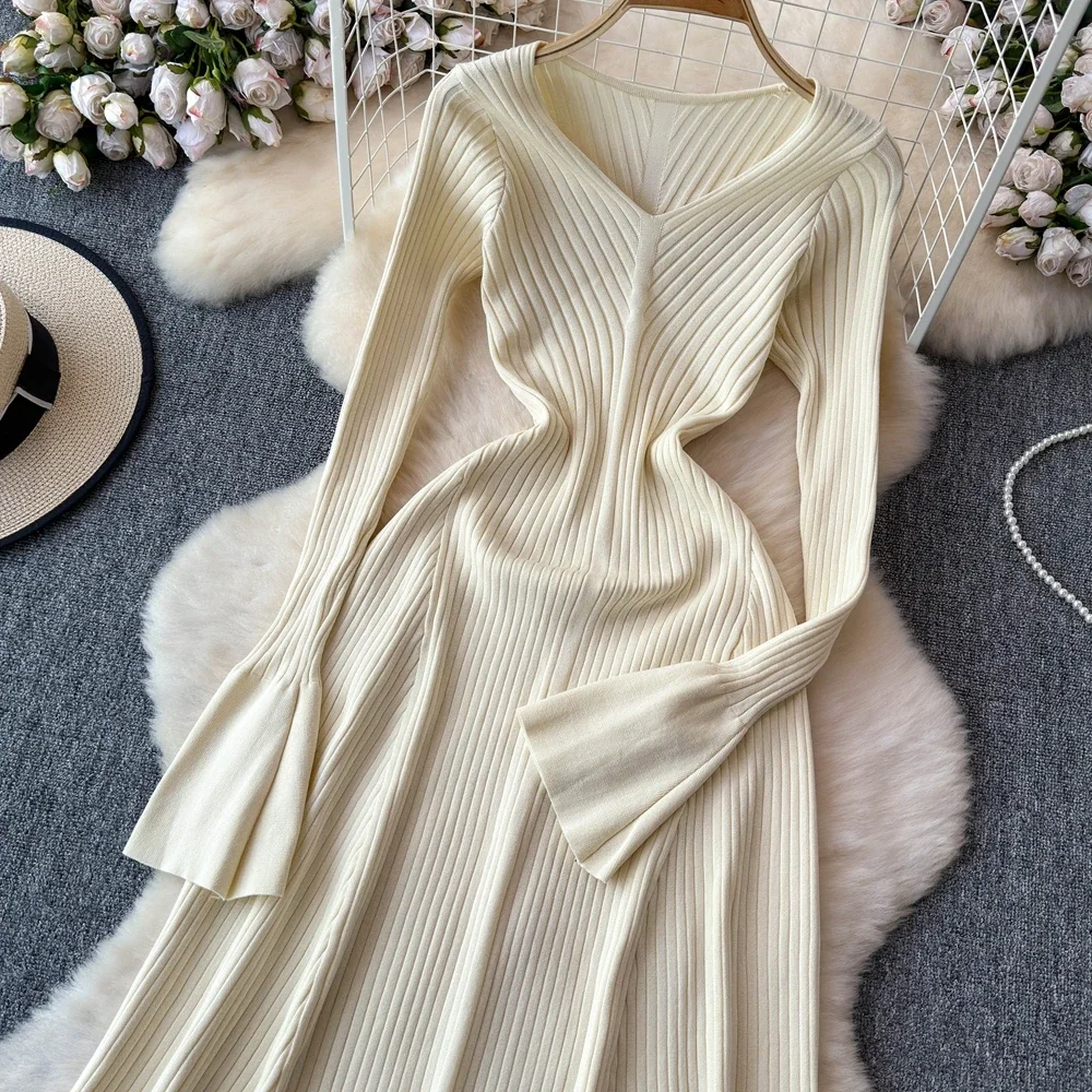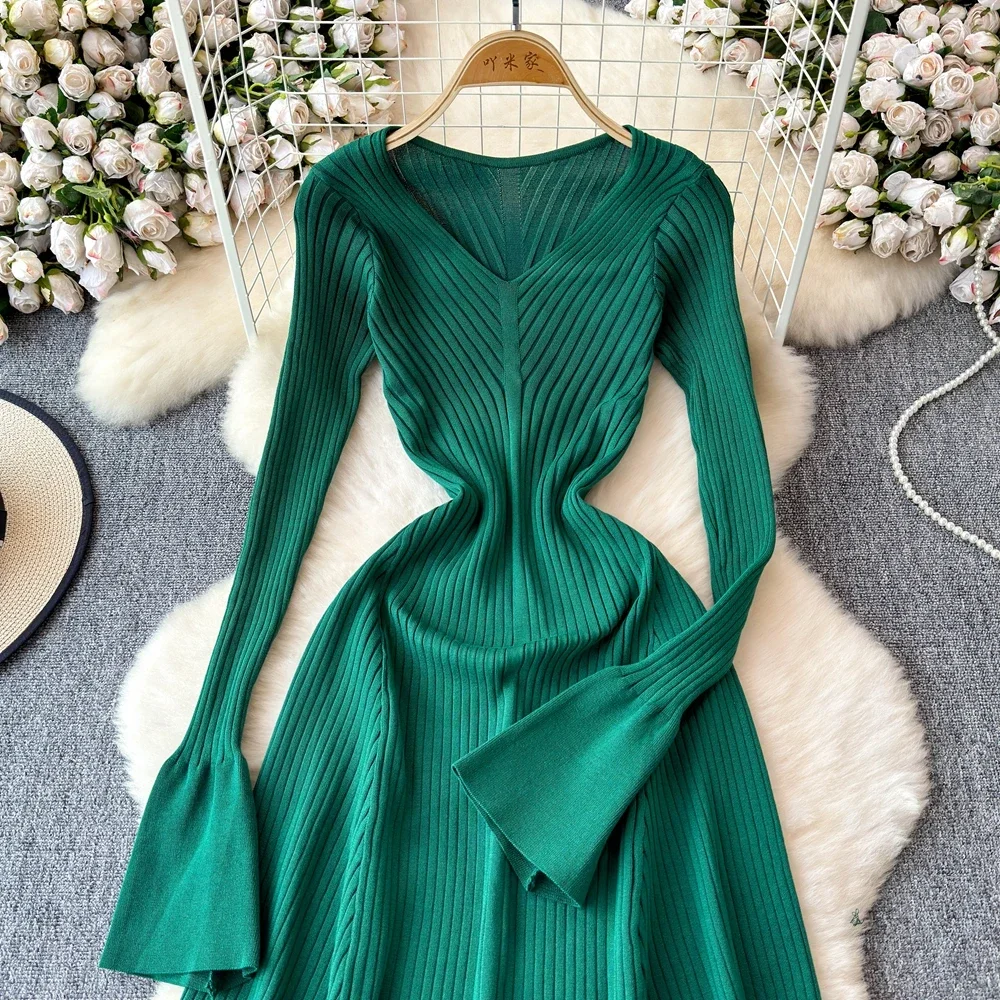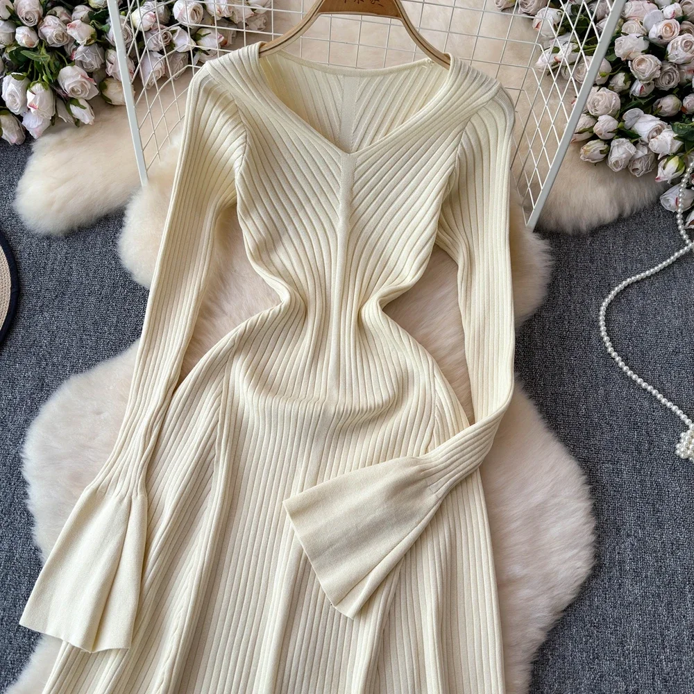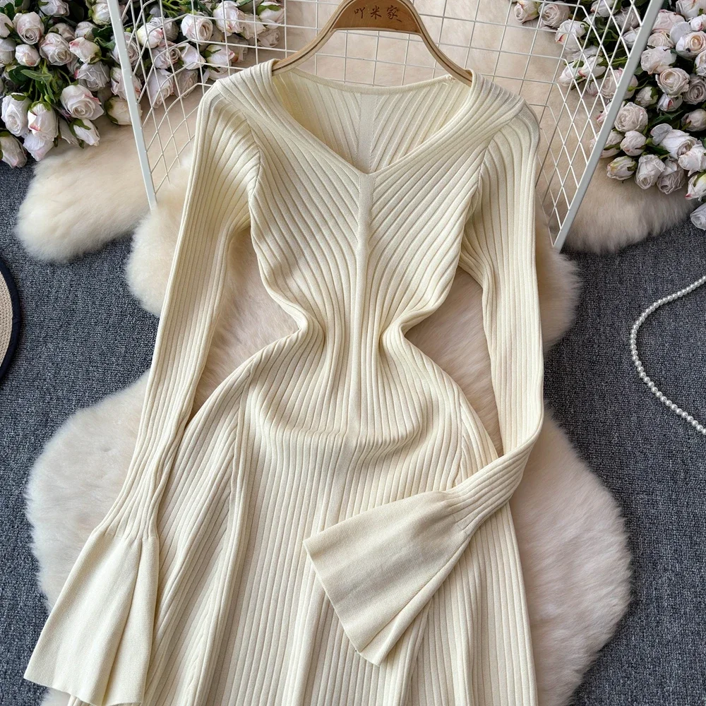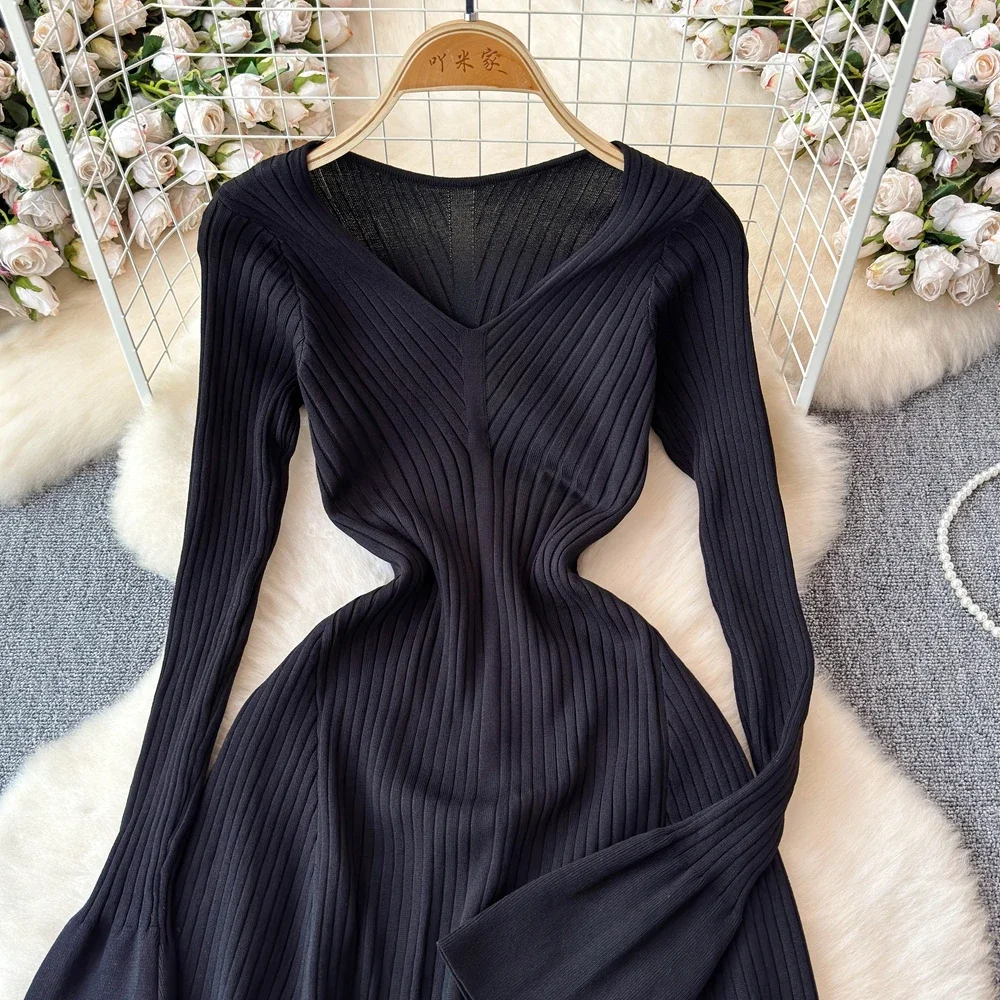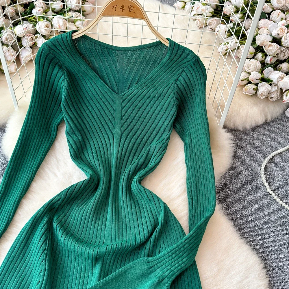 فستان طويل محبوك أنيق للنساء بأكمام مضيئة وفتحة رقبة على شكل V وكشكشة فساتين ضيقة للحفلات موضة المكتب للسيدات