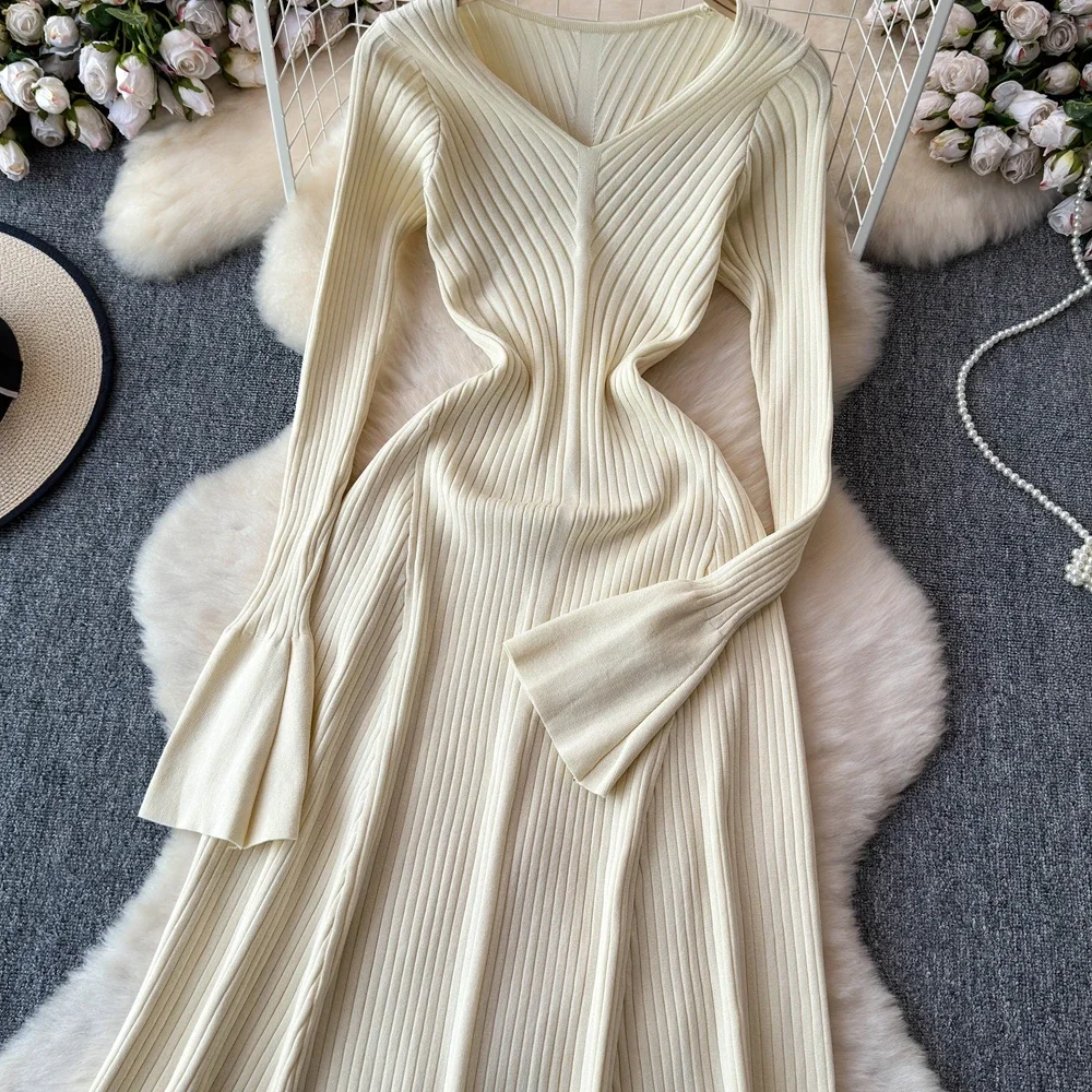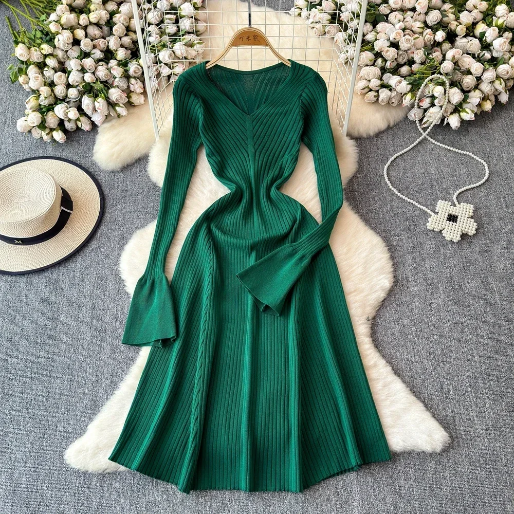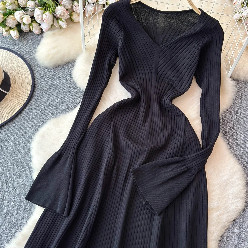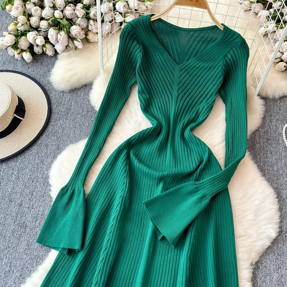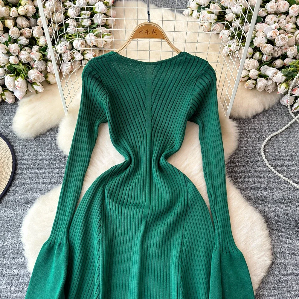 فستان طويل محبوك أنيق للنساء بأكمام مضيئة وفتحة رقبة على شكل V وكشكشة فساتين ضيقة للحفلات موضة المكتب للسيدات