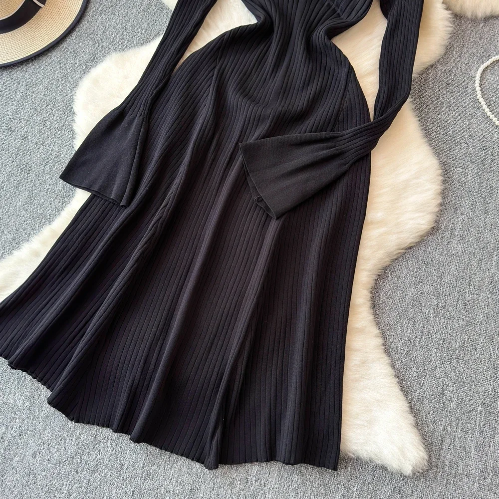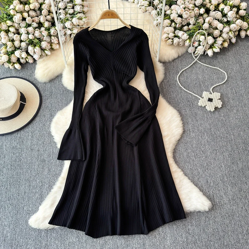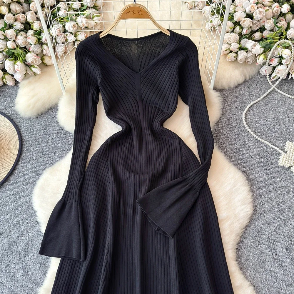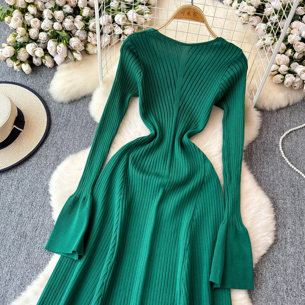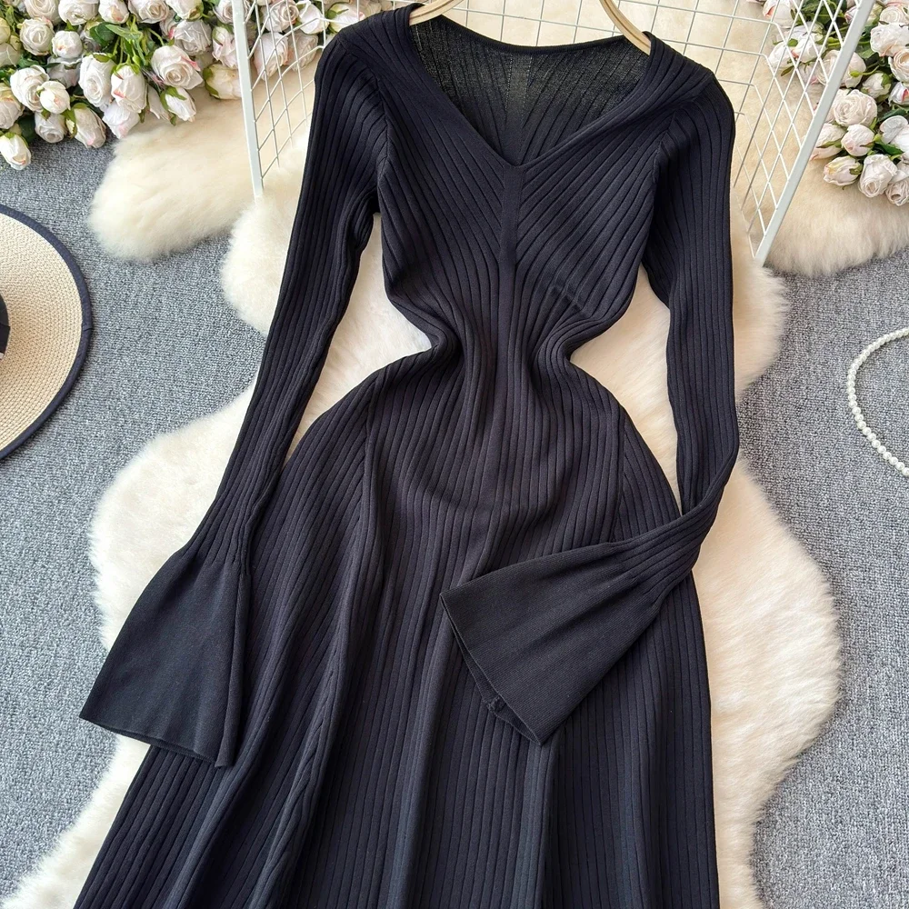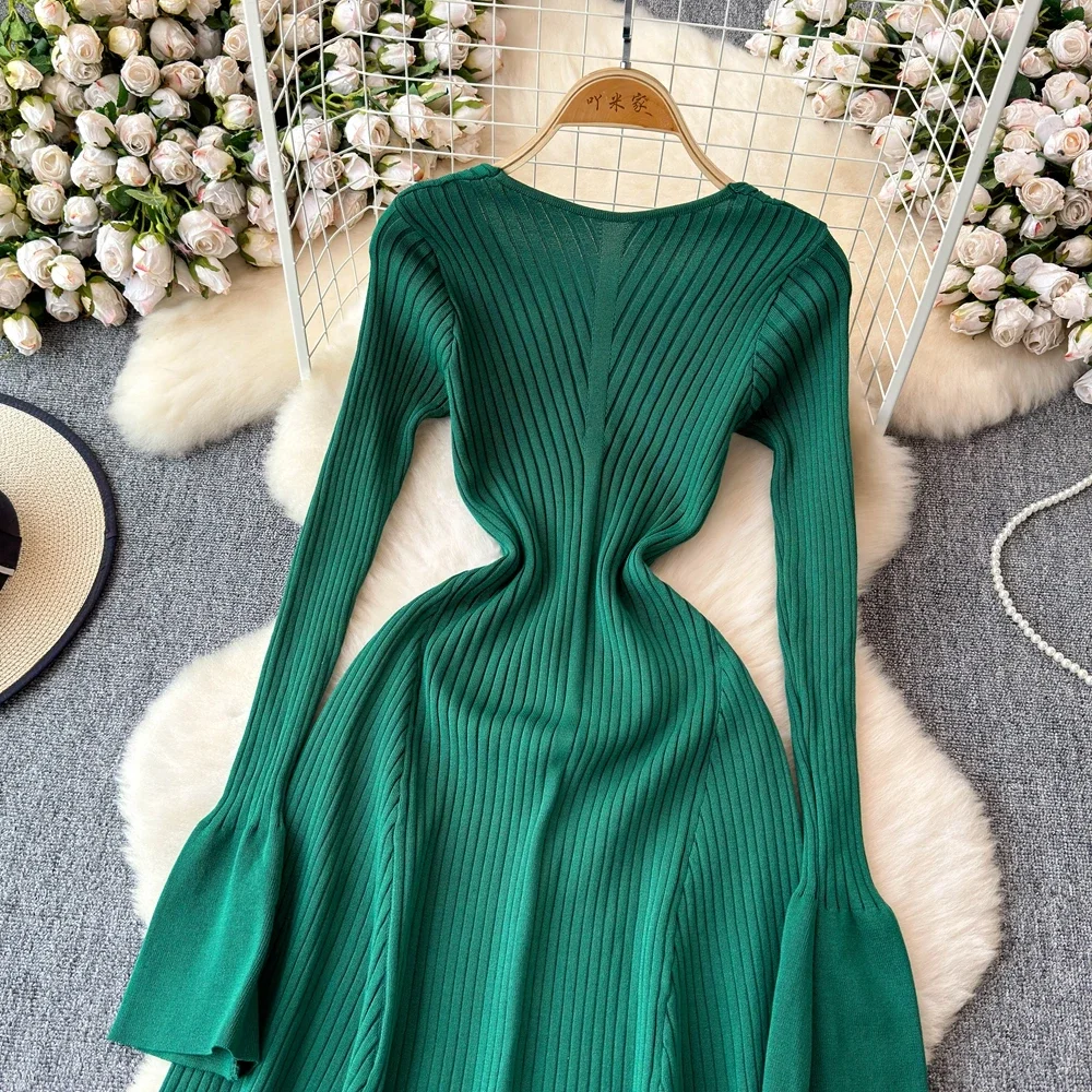 فستان طويل محبوك أنيق للنساء بأكمام مضيئة وفتحة رقبة على شكل V وكشكشة فساتين ضيقة للحفلات موضة المكتب للسيدات