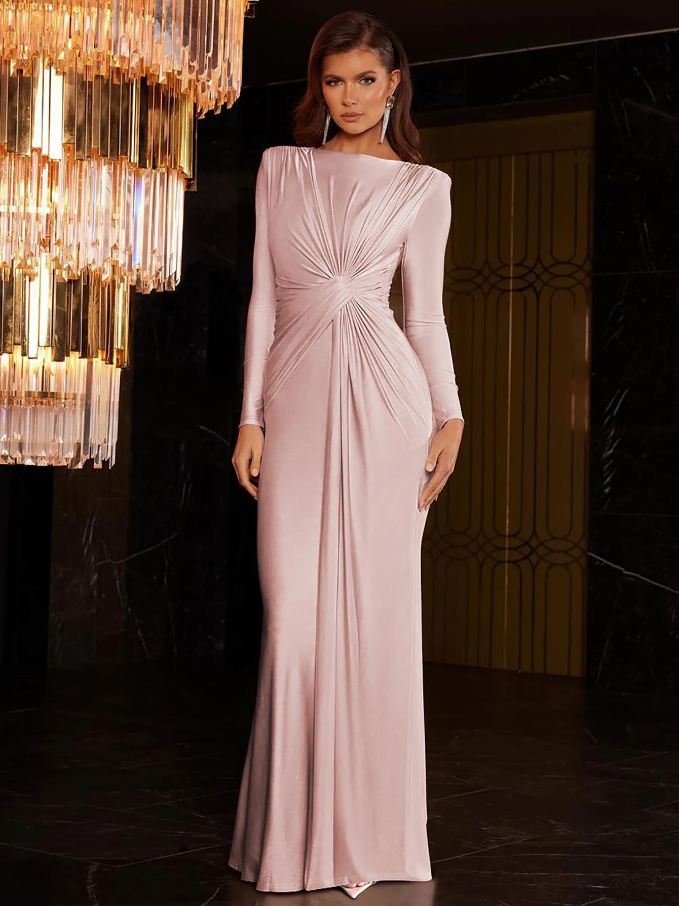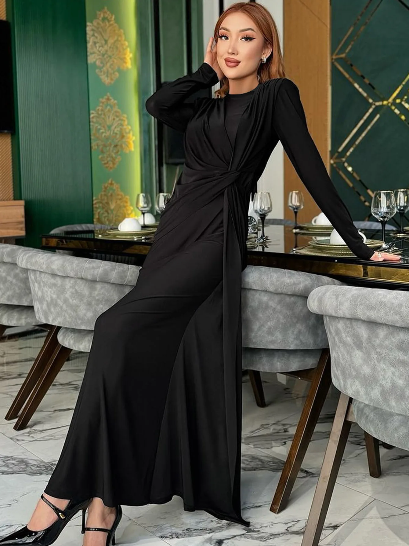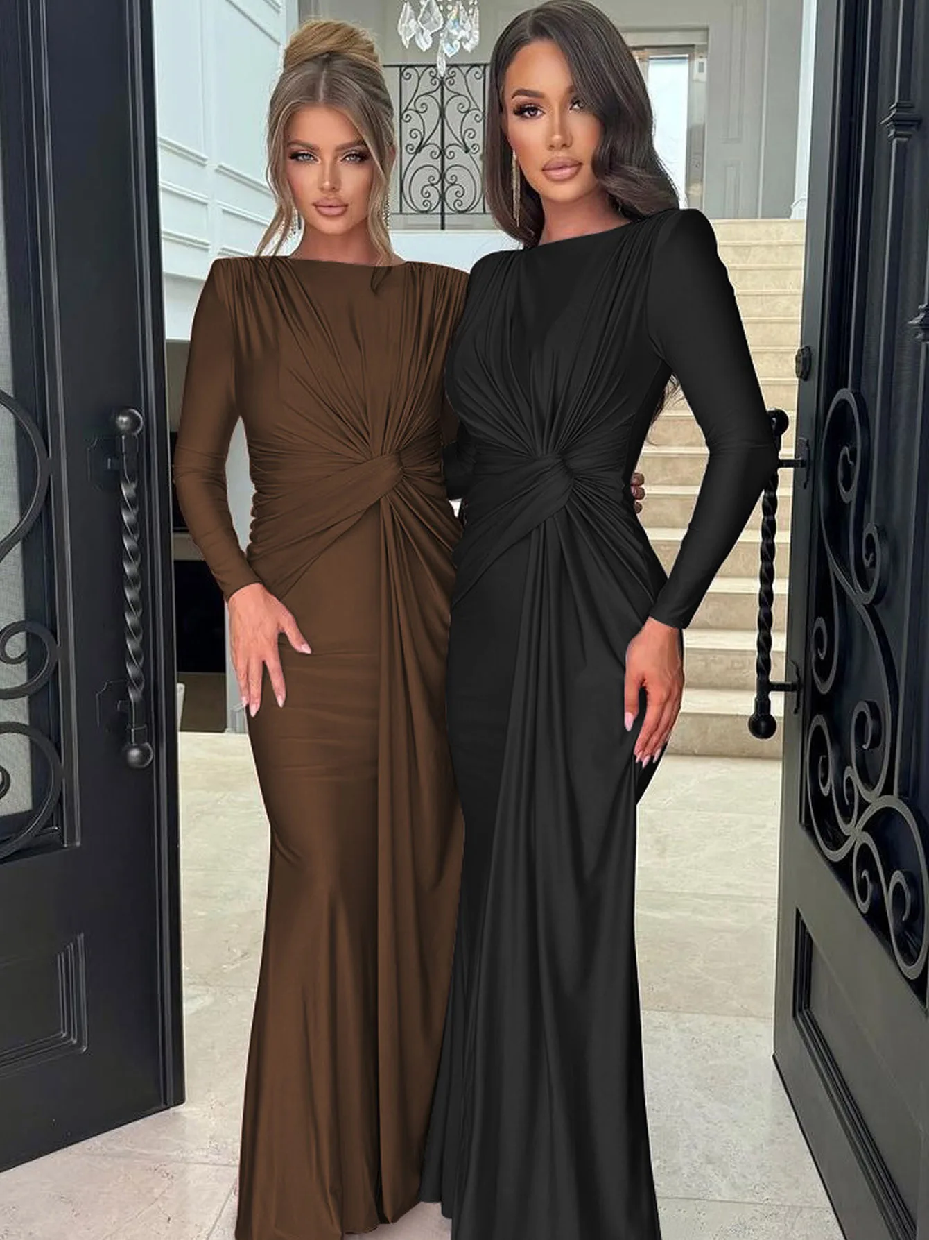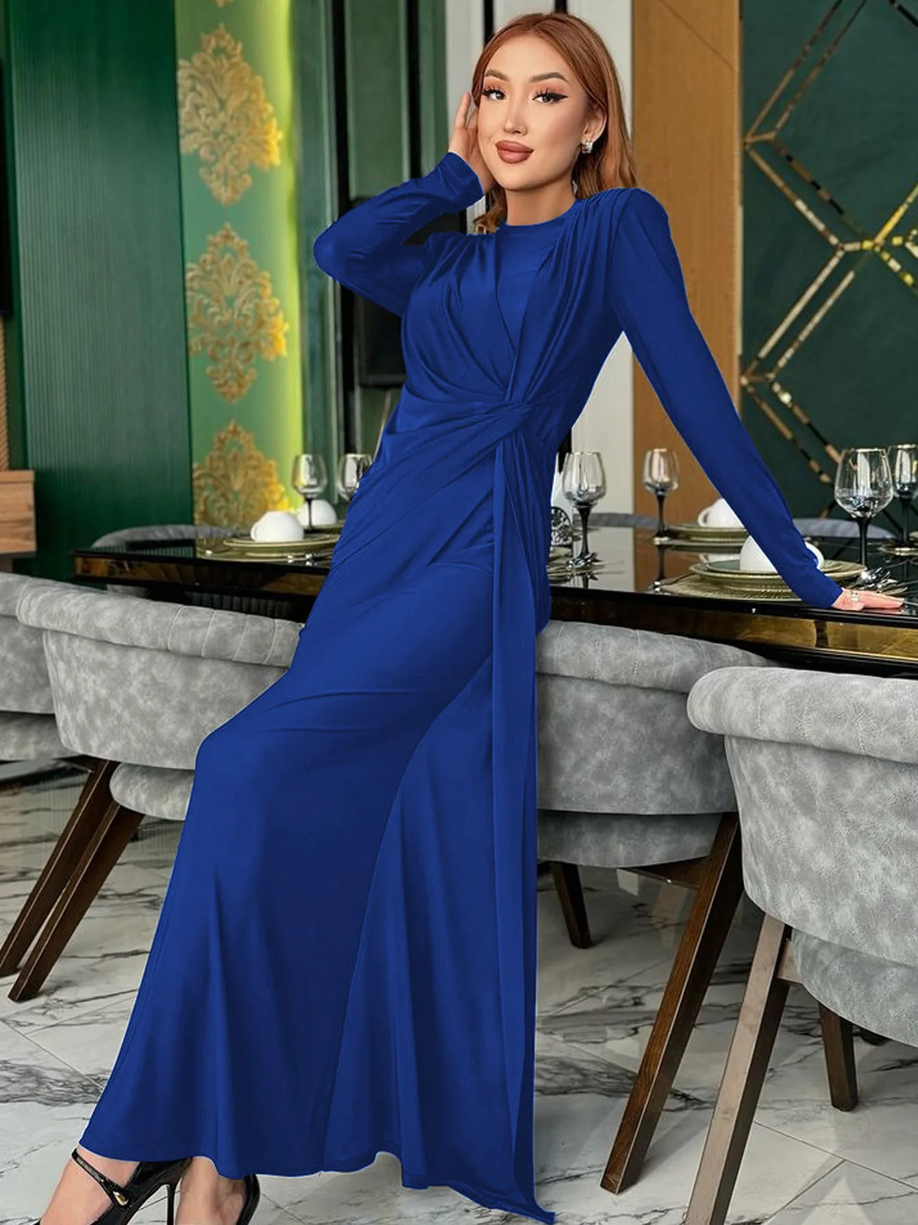 فستان نسائي فخم ذو تصميم فاخر يعكس الأناقة الراقية بأسلوب عصري يجمع بين لمسات البطانة المكشكشة على الأكتاف وخطوط الفستان الانسيابية ليمنحك إطلالة مثالية للسهرات والحفلات الراقية في مواسم الخريف والشتاء.