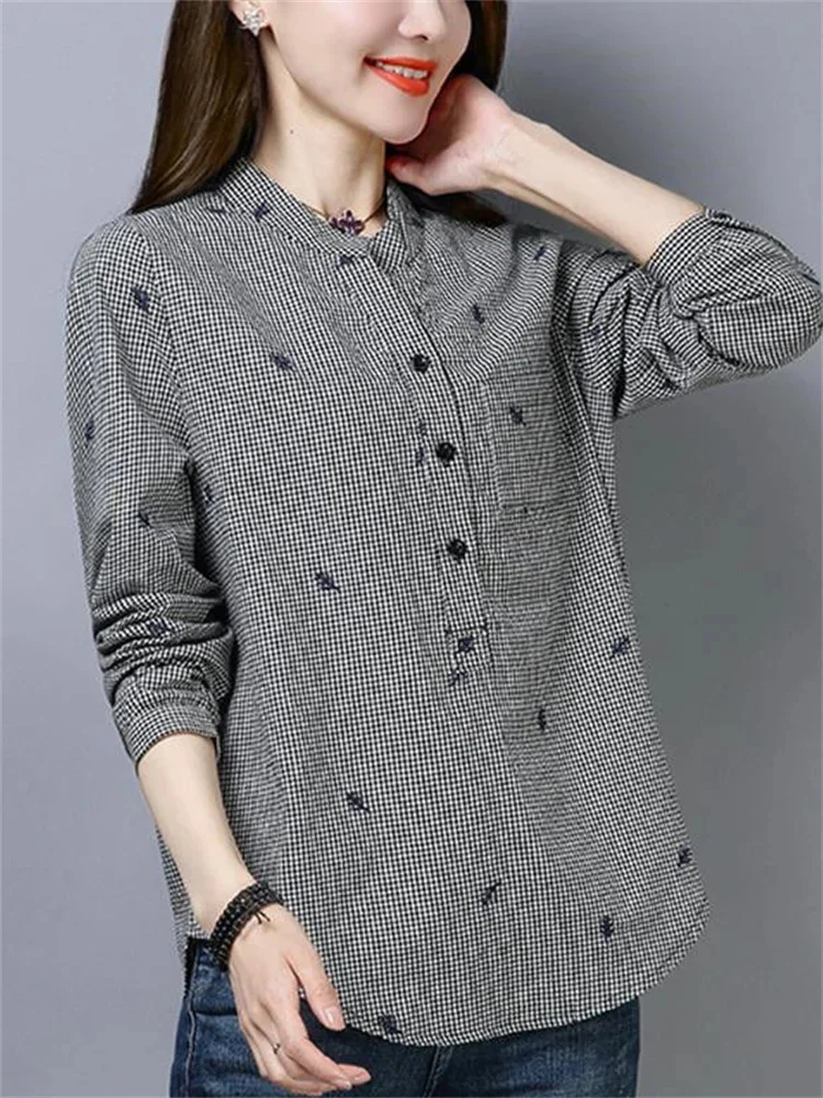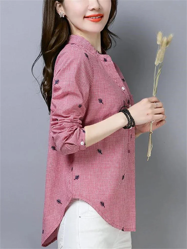 بلوزات نسائية قطنية على طراز ربيع الخريف قميص نسائي مطبوع بياقة مدورة وأكمام طويلة بلوزات كورية أنيقة